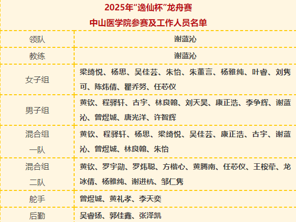“很高兴成为中山医龙舟队的领队兼桨手参加比赛,比赛中肌肉酸胀抵不过咬牙坚持的激昂,疲惫乏力压不住奋勇冲刺的热血。我们的日常训练淬炼出“越累越坚持”的中大龙魂,学院的全力保障铸就了劈波斩浪的底气。我们以每桨的爆发力诠释“救人救国救世,医病医身医心”的医者担当——这既是划破碧波的誓言,更是刻入血脉的信仰。”