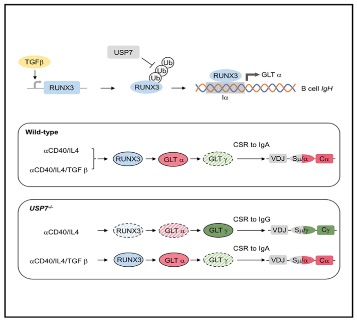 In summary, this study, using a cell model where transcriptional activity can be inhibited and reversed, confirms the importance of the loop extrusion model for the production of B cell antibody region germline transcription, the three-dimensional conformation of the antibody gene locus, and the CSR process. It also discovers the regulatory effects of the TGF-b signaling pathway and the deubiquitinating enzyme USP7 on the transcription factor RUNX3 at both transcriptional and post-translational modification levels, a regulatory mechanism that may also apply to other non-B cell scenarios involving TGF-b and USP7. Furthermore, given USP7's specific promotion of IgA rather than IgG antibodies, small molecule inhibitors targeting USP7's deubiquitinating enzyme activity may have potential therapeutic effects in IgA-induced inflammation, autoimmune, and other immune disorders.