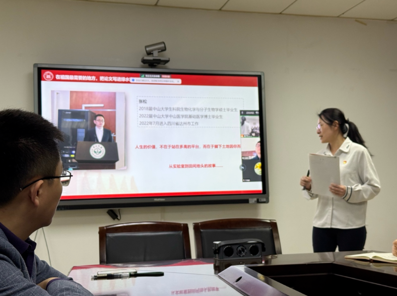 党支部书记黄潋滟教授详细介绍了张松学长的成长轨迹:张松,中共党员,四川万源人,中山大学生命科学学院硕士、中山大学中山医学院博士。2022年通过四川省急需紧缺专业选调生考试,扎根基层,服务乡村振兴和健康中国战略。