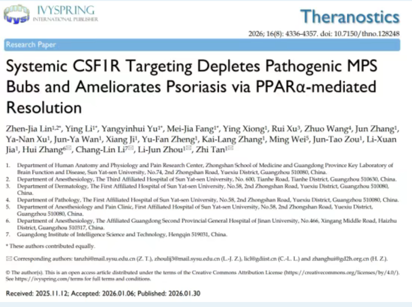 近日,中山大学中山医学院谈智/周利君教授团队,联合广东省智能科学与技术研究院李昌林研究员及暨南大学附属广东省第二人民医院张辉主任团队,在生物医学期刊 Theranostics(JCR 1区,中科院医学大类1区,新锐分区1区,IF: 13.3)上发表研究论文,揭示了CSF1R-PPARα轴在驱动银屑病皮肤及全身炎症中的核心作用,并提出系统性靶向CSF1R是重建免疫稳态、促进炎症消退的有效策略。