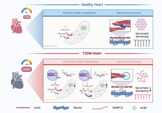 本研究首次提出“代谢-结构偶联”是糖尿病心肌病的重要发病机制,糖尿病状态下ACBP可作为同时改善心肌代谢和结构异常的双效靶点,靶向干预ACBP可同步实现心肌代谢重塑(恢复底物代谢灵活性)和结构修复(解除ACBP-MyBPC3病理互作),有望成为改善DCM的潜在治疗靶点。