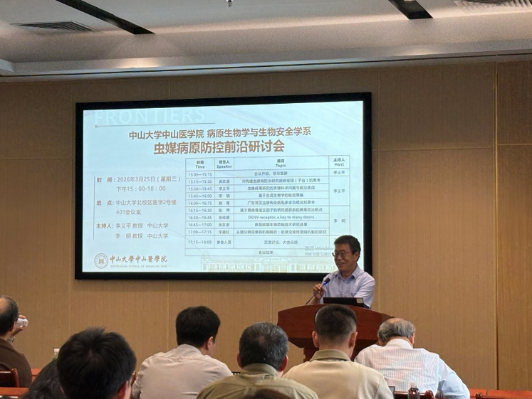 为聚焦虫媒病原防控领域前沿动态,推动学科交叉融合与科研创新,2026年3月25日下午,中山大学中山医学院病原生物学与生物安全学系主办的“虫媒病原防控前沿研讨会”在北校区医学2号楼401会议室顺利召开。本次研讨会由中山医学院李义平教授与李明教授共同主持,周家国副院长、热带病防治研究教育部重点实验室主任邓凯副院长及多位领域内专家学者受邀发言,学院师生代表参会交流,张辉教授担任大会总结嘉宾。