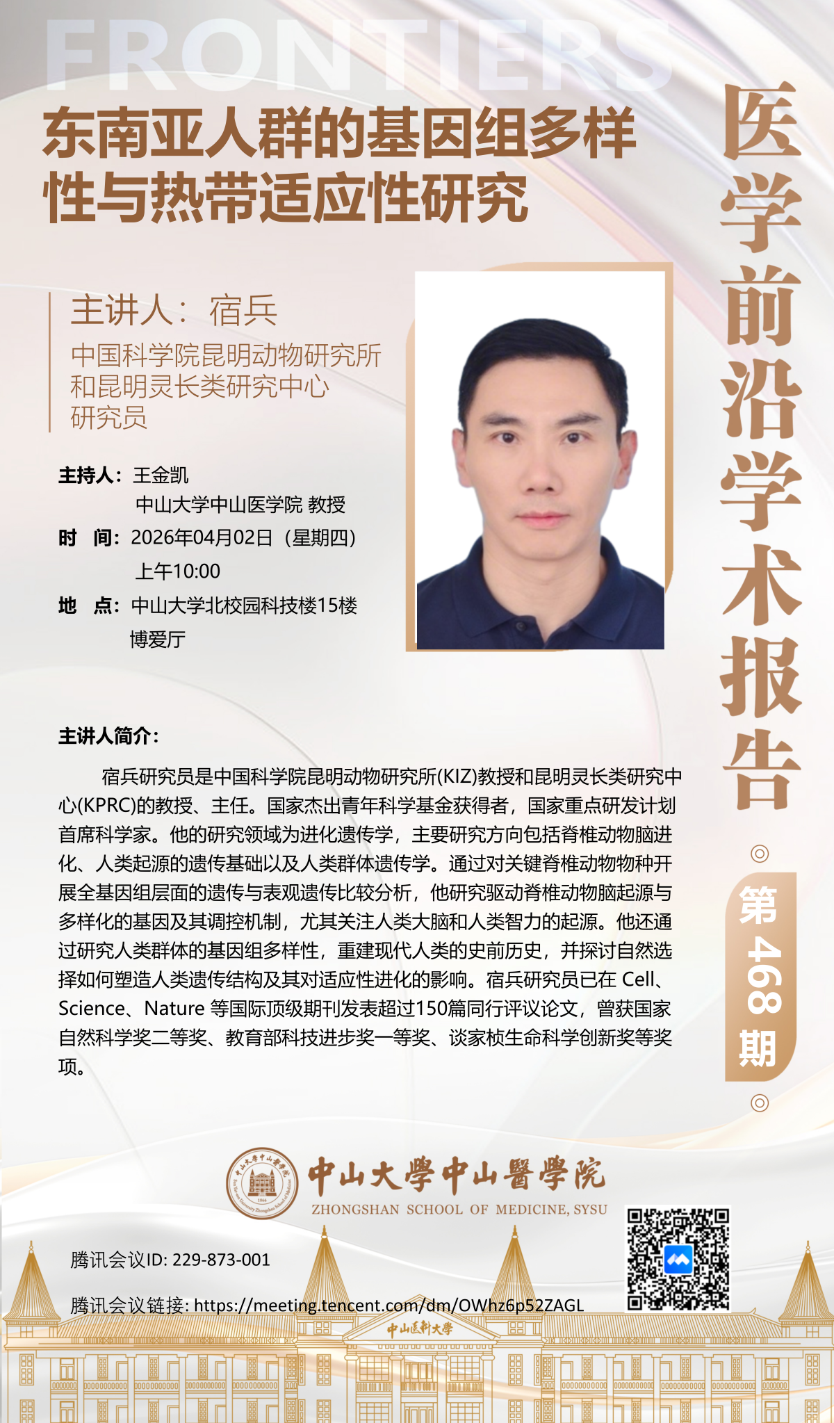 导航痕迹 DBgame 科学研究 学术讲座 医学前沿学术报告第468期 科学研究 科研通知 学术讲座 科研平台 办理指引 医学前沿学术报告第468期 东南亚人群的基因组多样性与热带适应性研究 发布人:何军芳 发布日期:2026-03-24