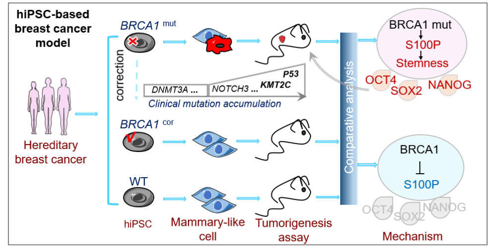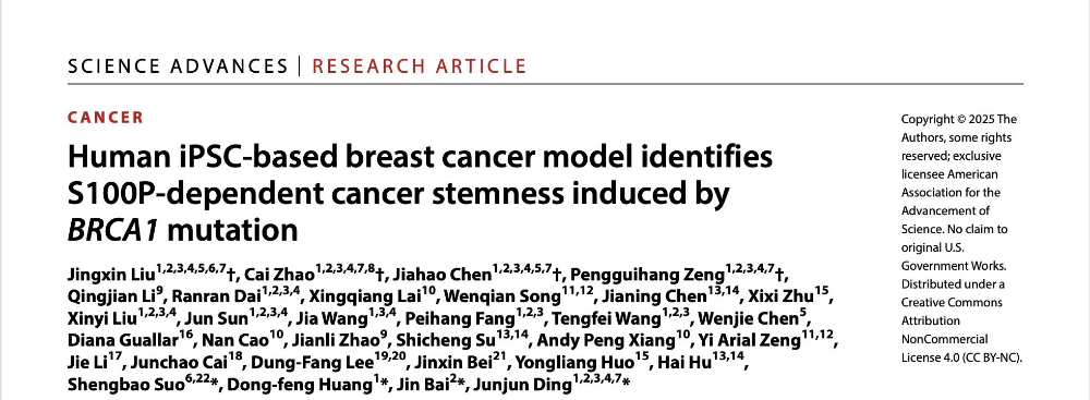 近日,中山大学丁俊军团队在Science Advances上发表的重要研究Human iPSC-based breast cancer model identifies S100P-dependent cancer stemness induced by BRCA1 mutation,首次利用人来源的诱导多能干细胞(iPSC)成功构建了功能性乳腺样细胞(iPSC-MCs),并在此基础上建立了BRCA1突变相关的乳腺癌发生模型。并揭示了S100P依赖的肿瘤干细胞是BRCA1突变驱动肿瘤发生的关键机制。