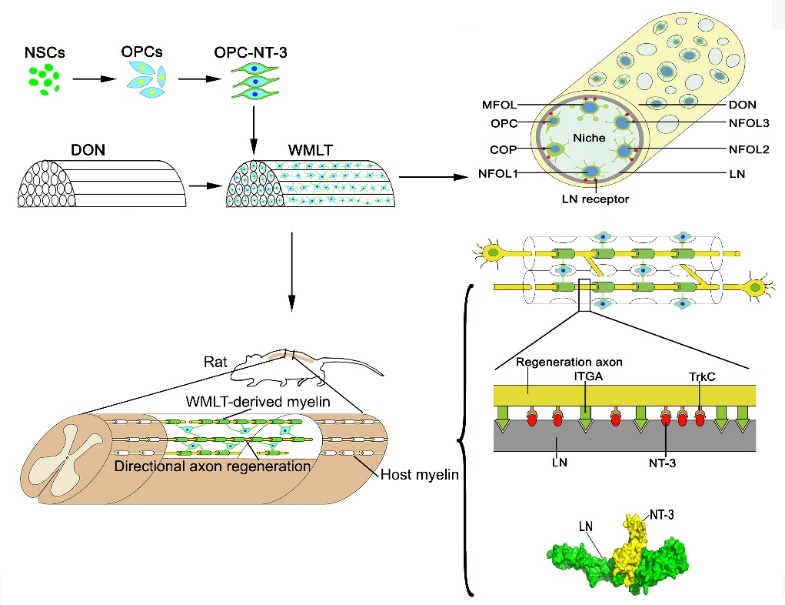 图示: 类白质(WMLT)构建及其移植修复大鼠半横切背侧脊髓损伤的机制将神经干细胞(NSCs)诱导为少突胶质前体细胞(OPCs),通过基因修饰使之过表达NT-3,再OPC-NT-3种植于去细胞猪视神经(DON)构建WMLTWMLT内微环境形成支持少突胶质细胞谱系的定植、分化和功能成熟的独特生态位(ecological niche)WMLT移植到半横切背侧脊髓损伤处,DON通道表面的富含的层黏连蛋白(LN)能够和少突胶质细胞所分泌的NT-3亲和结合,营造局部富集NT-3的微环境。LN还能够通过与少突胶质细胞表面和再生轴突表面的整合素(ITGA)通过配体(NT-3)和受体(TrkC)结合的方式引导轴突直行长和髓鞘化,从而在WMLT移植后与宿主脊髓组织实现更好的结构整合和功能修复。