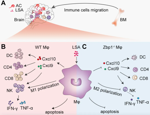 研究团队发现,在AC所致感染性脑炎模型中,骨髓来源的巨噬细胞Zbp1表达上调,并通过与RIPK3直接结合,激活RIP3-MLKL信号轴,促进巨噬细胞的凋亡、M1极化和趋化因子CXCL9与CXCL10的分泌,进而募集免疫细胞并激活CD8+ T细胞及NK细胞分泌TNF-α和IFN-γ,促进AC感染性脑炎的发生发展。而在AC感染的Zbp1敲除小鼠中,巨噬细胞M2型极化增强,凋亡减轻,淋巴细胞(CD4+ T、CD8+ T)浸润及NK细胞毒性显著降低,从而减轻中枢神经炎症反应。